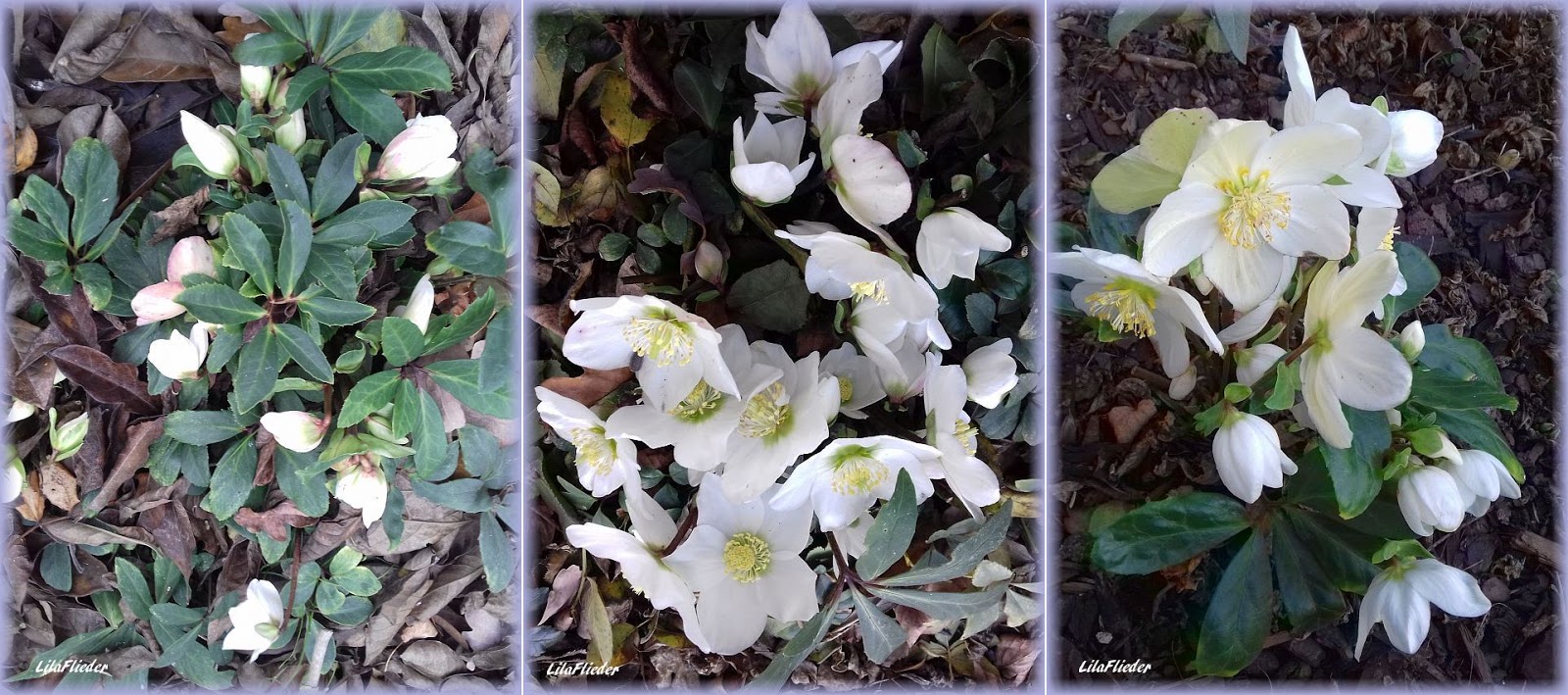 Denn jetzt ist erst einmal Christrosenzeit im Garten. Die Christrosen stehen pünktlich zur Weihnachtszeit in voller Blüte. Ich freue mich, dass sie jedes Jahr prächtiger blühen. Sogar eine Biene konnte ich heute an den Christrosen entdecken.
